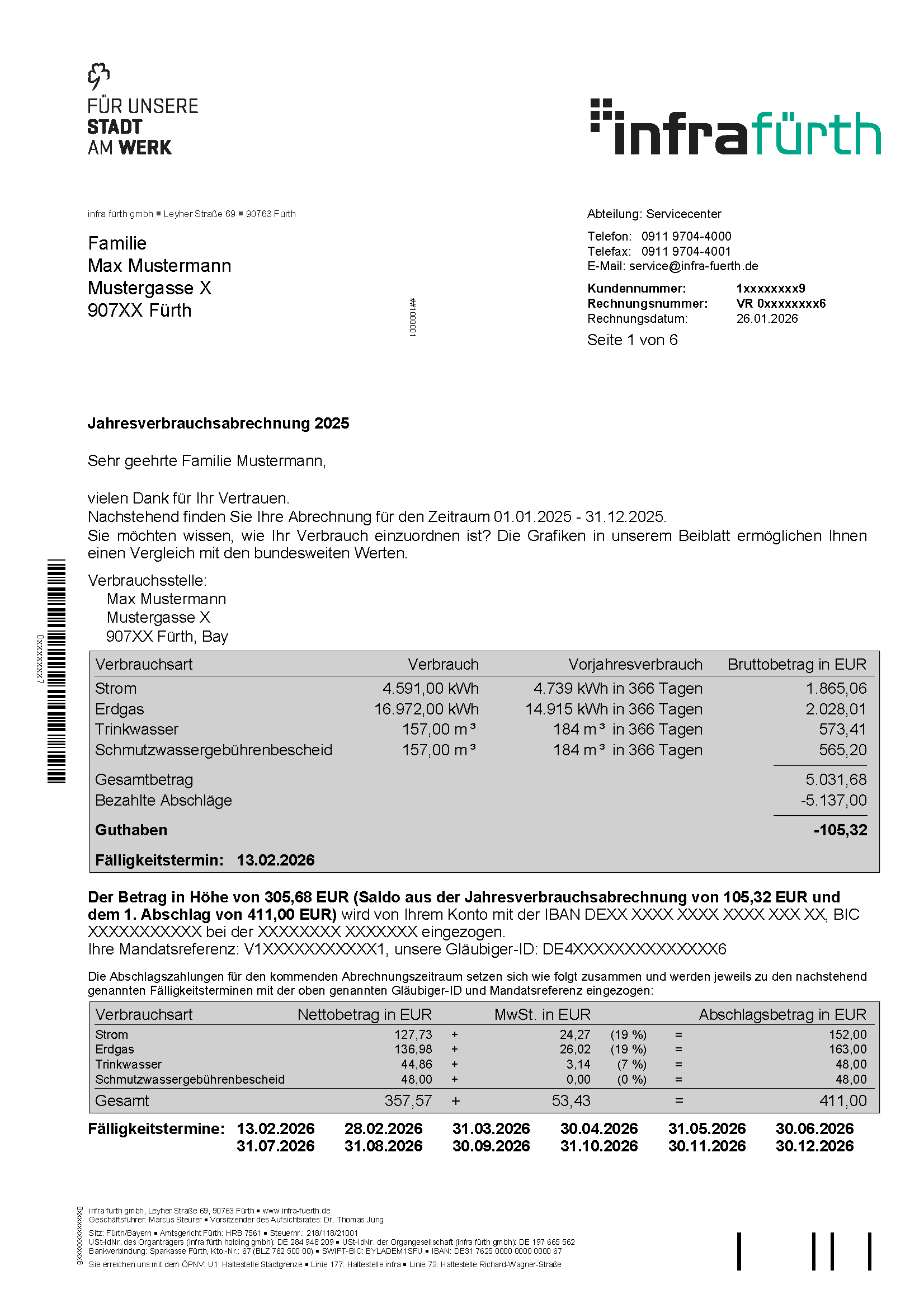 Aufgrund Ihres aktuellen Verbrauches und der aktuellen Preise wird der neue Gesamtabschlag für das kommende Abrechnungsjahr ermittelt und die Fälligkeitstermine mitgeteilt. Der Fälligkeitstermin für den ersten Abschlag ist identisch mit der Fälligkeit der Jahresverbrauchsabrechnung.