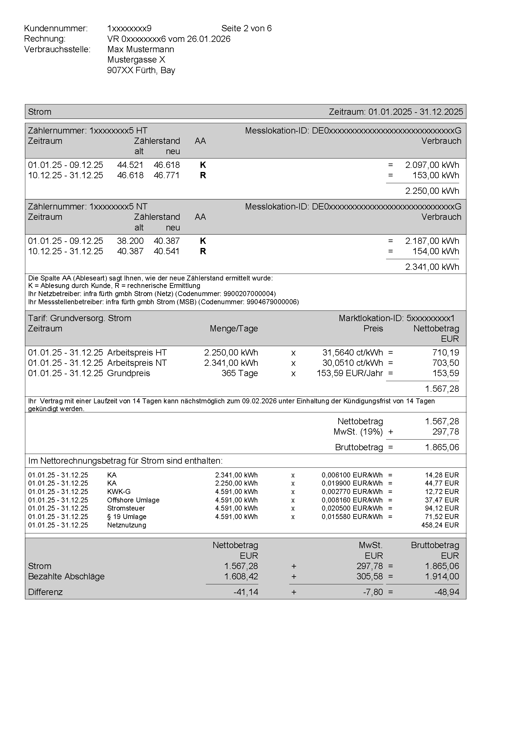 Ergebnis aus Verbrauch x Arbeitspreis und Ergebnis aus Grundpreis/Jahr: 365 (366) x Anzahl Tage. -