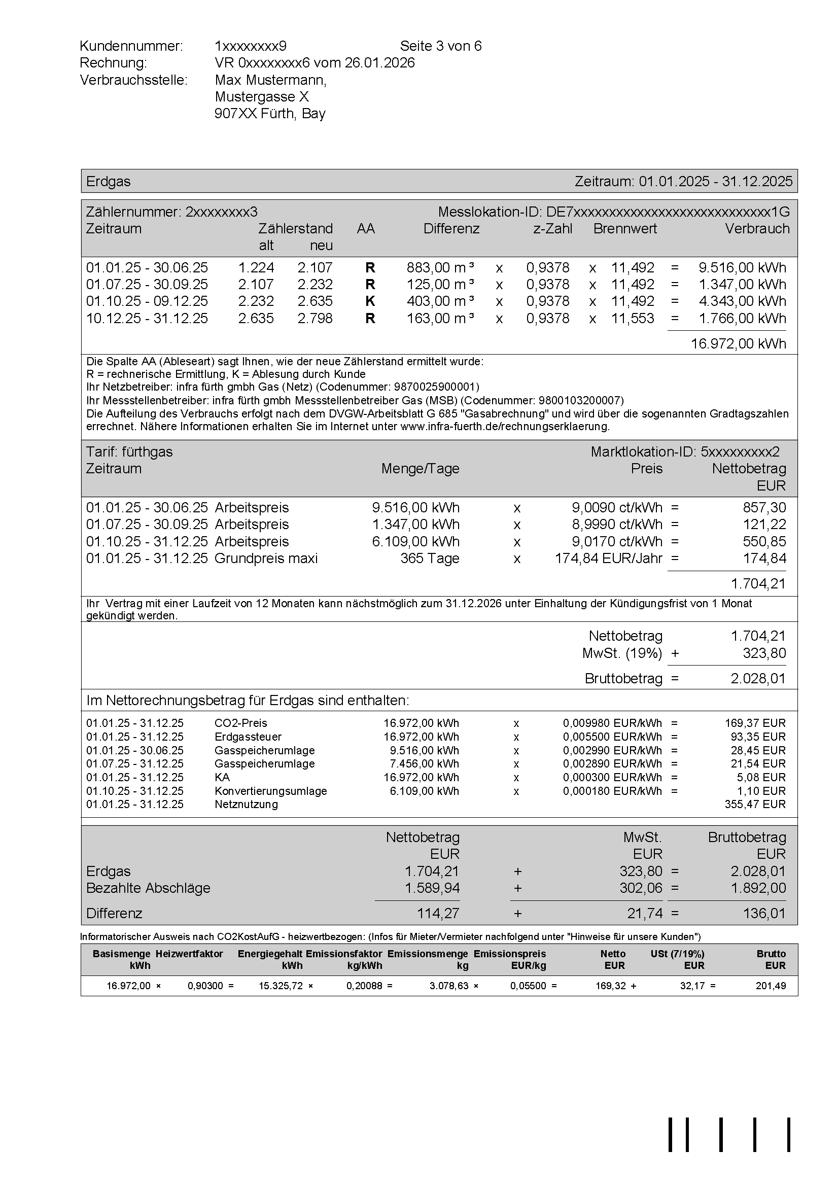 Der Bruttobetrag wird hier mit den für diese Verbrauchsart gezahlten Abschlägen verrechnet. Aus dieser Berechnung ergibt sich die Differenz als Guthaben oder Nachzahlung (Guthaben werden als negativer Betrag ausgewiesen). -
