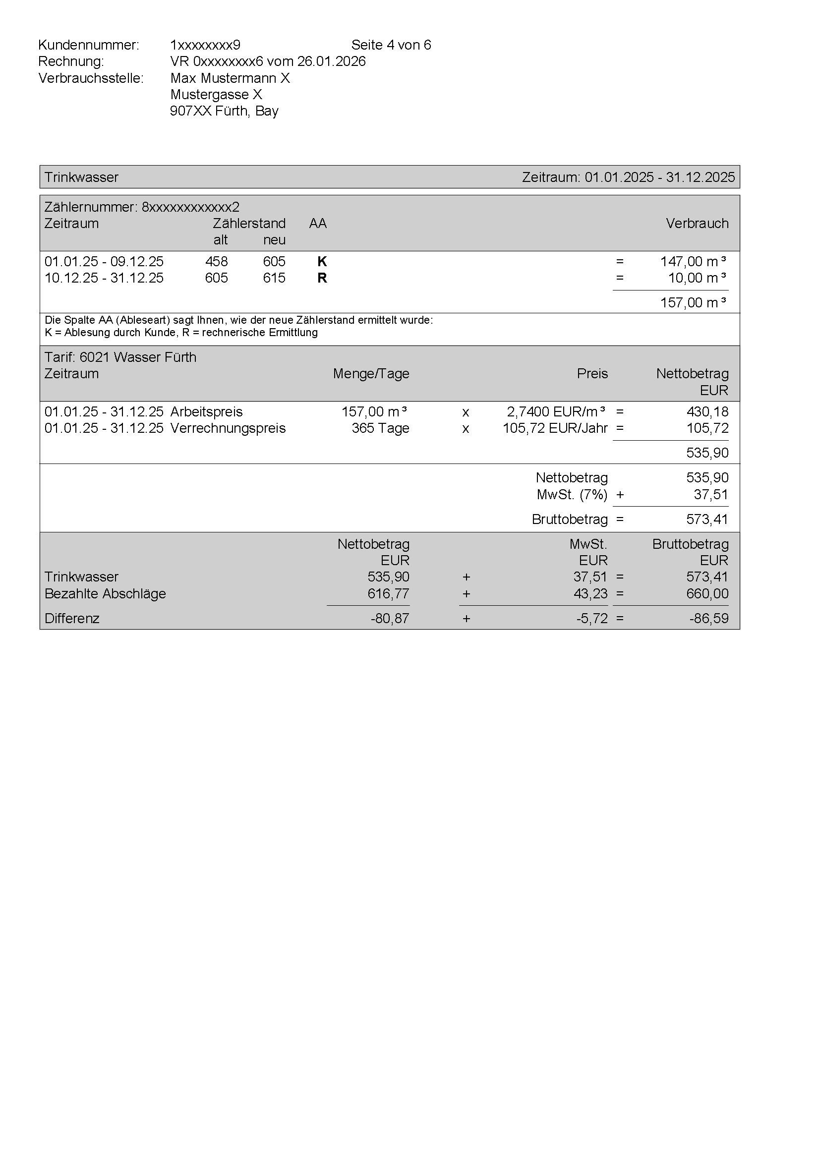 Der Bruttobetrag wird hier mit den für diese Verbrauchsart gezahlten Abschlägen verrechnet. Aus dieser Berechnung ergibt sich die Differenz als Guthaben oder Nachzahlung (Guthaben werden als negativer Betrag ausgewiesen).