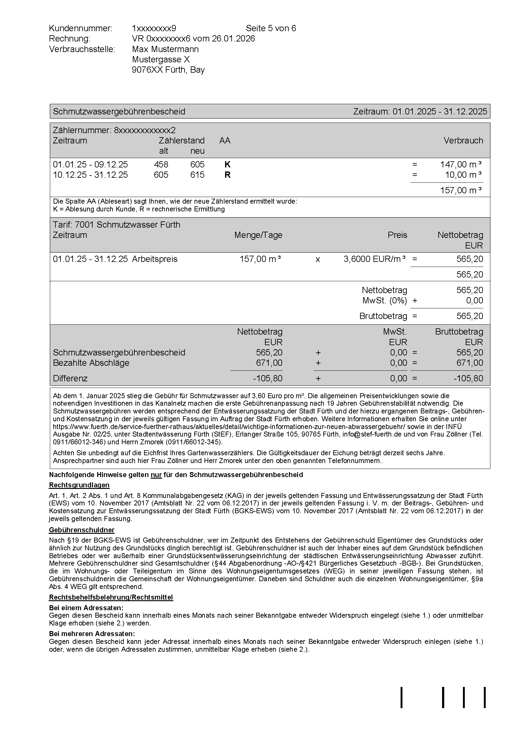 Die Schmutzwassergebühren werden im Auftrag der Stadt Fürth entsprechend der Beitrags- und Gebührensatzung zur Entwässerungssatzung in ihrer jeweils geltenden Fassung erhoben. -